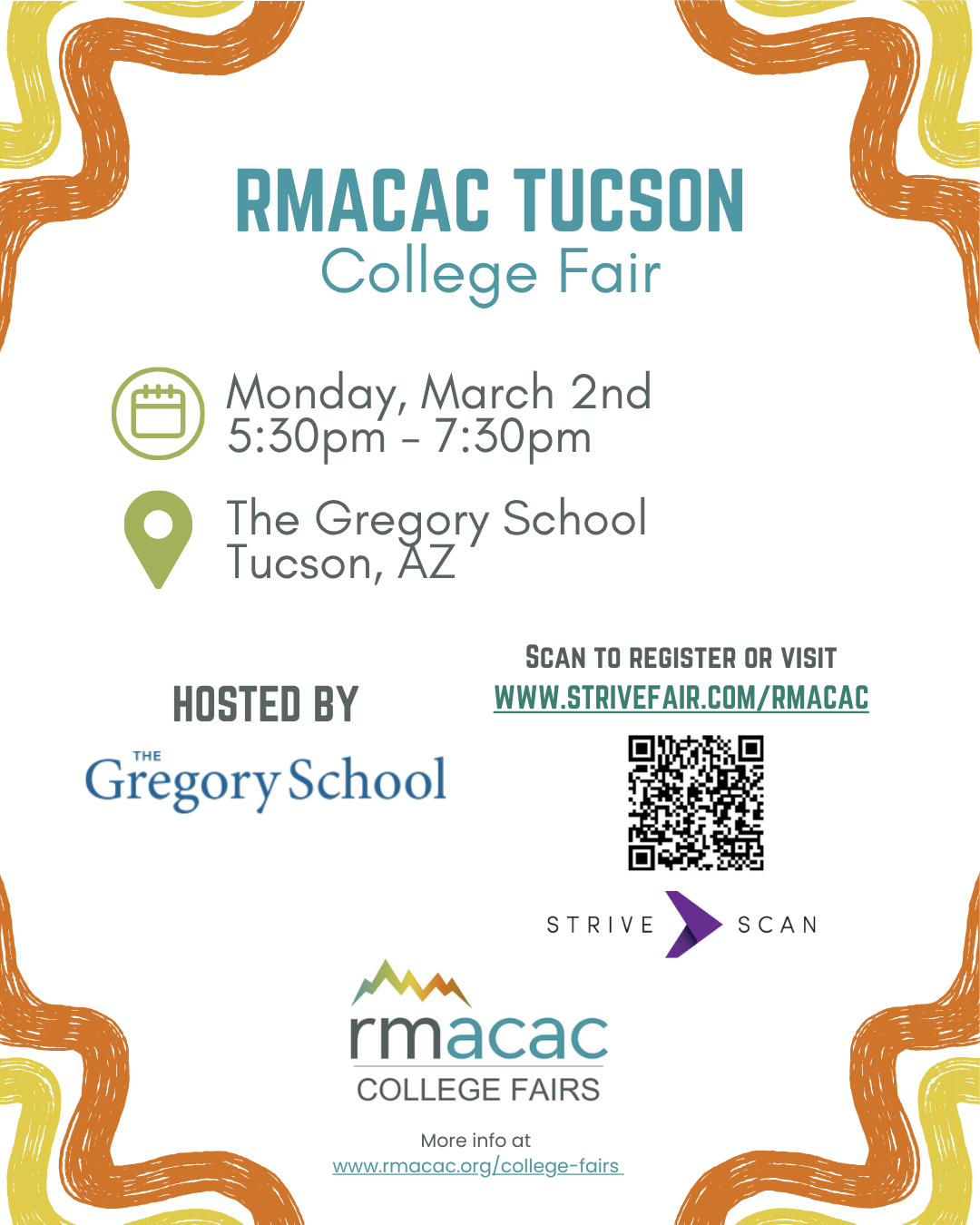 Information specifically for you!For Students and FamiliesFree and open to the public, RMACAC fairs connect you with colleges and universities in one convenient location. The fair will take place on March 2, 2026 from 5:30pm-7:30pm at The Gregory School (3231 N Craycroft Rd, Tucson, AZ 85712). Parking for Students and Families: Parking info coming soon. Students: Register in advance with StriveScan by completing a quick form. After you sign up, StriveScan will send a barcode via text message and email. At the college fair, present your barcode to college representatives to receive more information about that college. The next day, you will receive an email with a report of all of the colleges and representatives you met, along with their contact information and social media profiles. Student RegistrationFor High School CounselorsRegistration: No need to register yourself for the college fair; however, encourage your students to sign up for a barcode before they attend the fair at www.strivefair.com. Promotion: We’ve created the following digital toolkit for you to help promote this regional fair. Feel free to share these within your local networks as well!